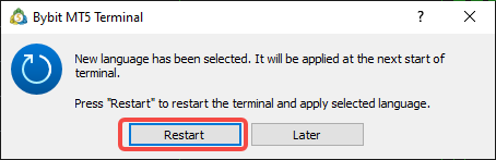 完成後,將出現一個對話框,提示您重新啟動終端。點選“重啟”,新語言將在 MT5 用戶端終端重新啟動後套用。
