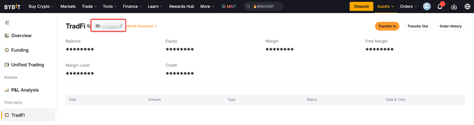 為了提供無縫存取和更便利的交易體驗,TradFi 已整合至您的 Bybit 帳戶。然而,您仍可透過 MetaTrader 用戶端,使用您的 MT5 帳戶 ID 進行交易。成功啟用您的 TradFi 帳戶後,您可以點擊帳戶詳情下方的 MT5 ID 區塊,查看您的登入 ID 詳細資訊。