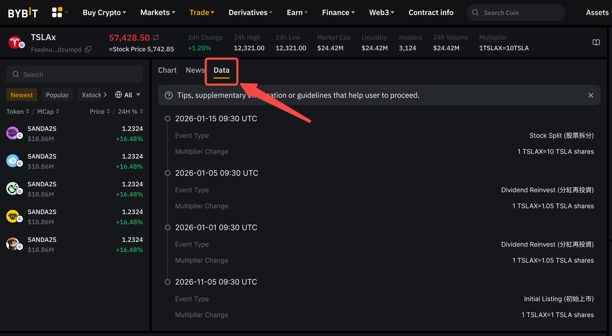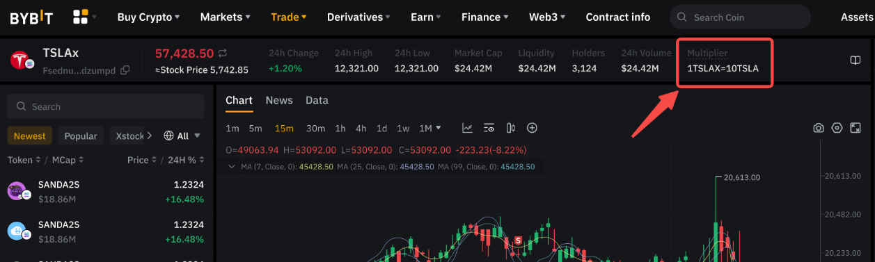 如果您使用的是 Bybit App,請前往 xStocks 交易頁面,在價格資訊附近(圖表上方)找到當前係數。