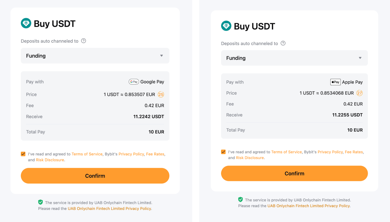 現在您可以使用 Google Pay 和 Apple Pay 在 Bybit 上使用超過 36 種法定貨幣購買加密貨幣。請注意,此付款方式僅在此處列出的支援國家/地區提供。