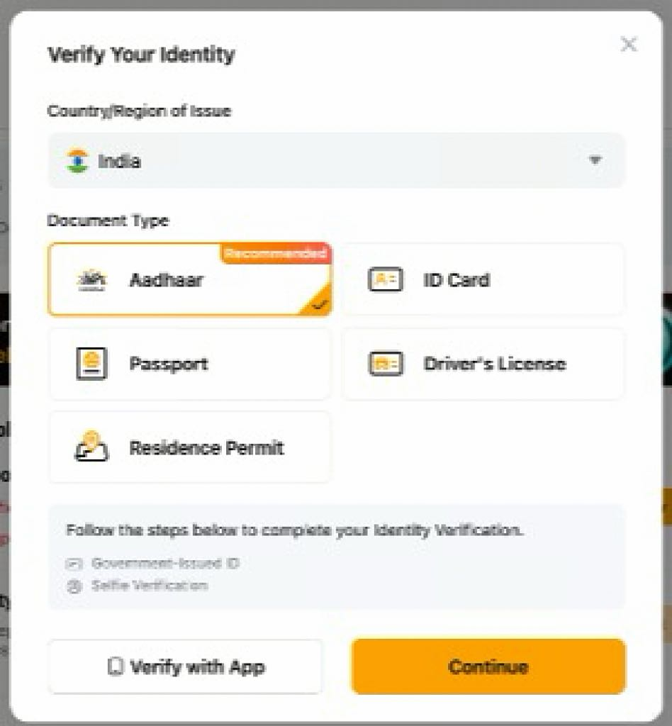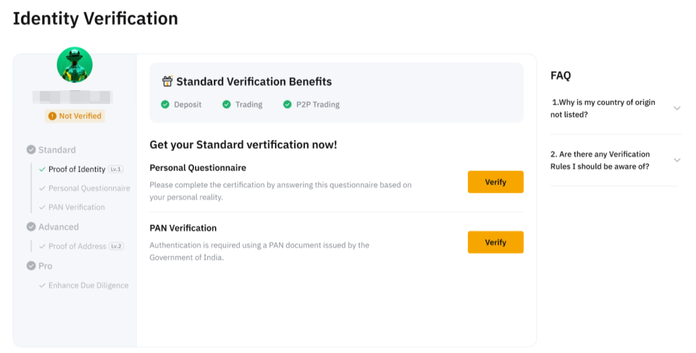 作為標準驗證流程的一部分,印度公民將需要完成一組個人問卷和永久帳號 (PAN) 驗證。