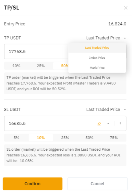 價格下方的百分比指示條表示可實現的收益率。例如,跟單用戶 A 將止損比例設置為 10%,並將最新成交價作為參考價格。系統自動計算出的止損價為 $16,635.5. 這意味着,當最新成交價達到 $16,635.5 時,系統將觸發止損訂單,屆時其收益率大約為 -10%。