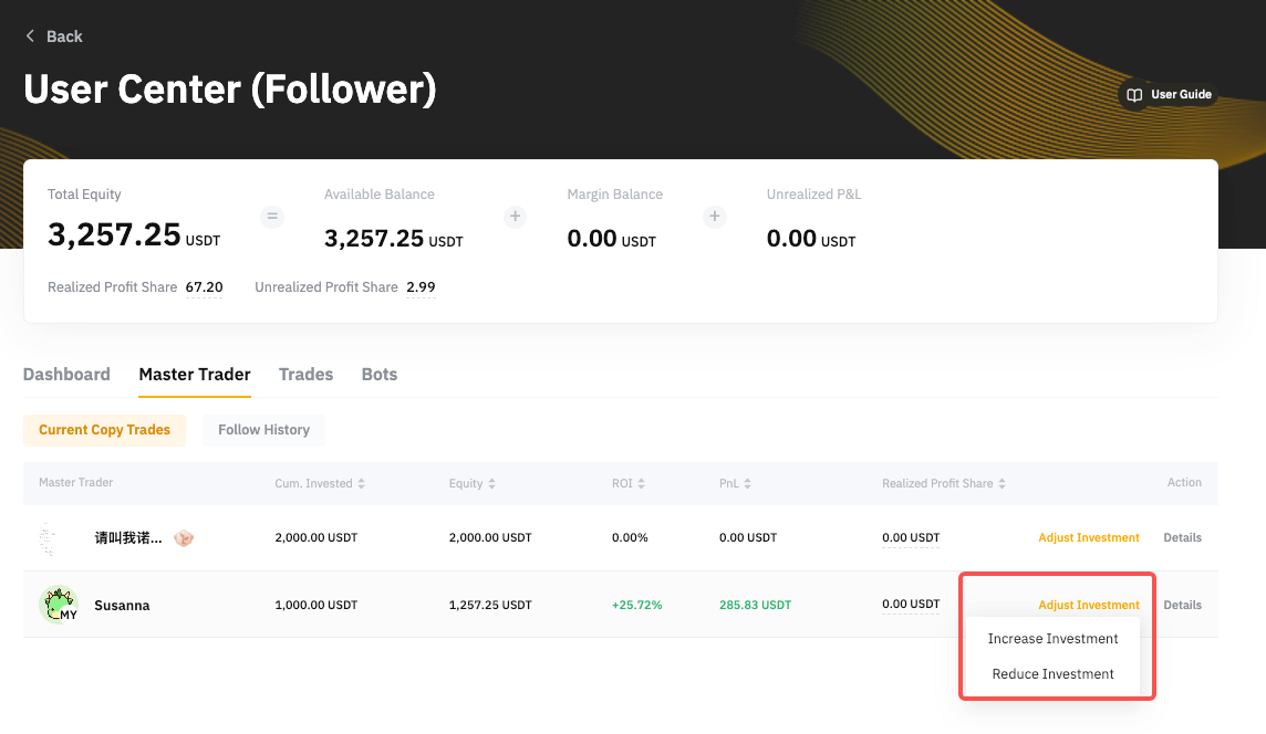 第 1 步:進入跟單用戶中心 → 交易達人 → 調整跟單本金。然後,點擊追加跟單本金或減少跟單本金。