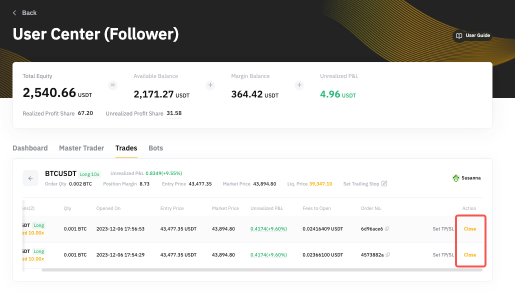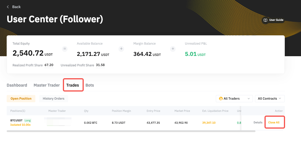 如果您想對交易達人跟單倉位進行全平,請前往跟單用戶中心 → 交易 → 當前開倉,然後點擊全部平倉以市價進行全平。