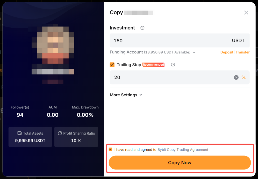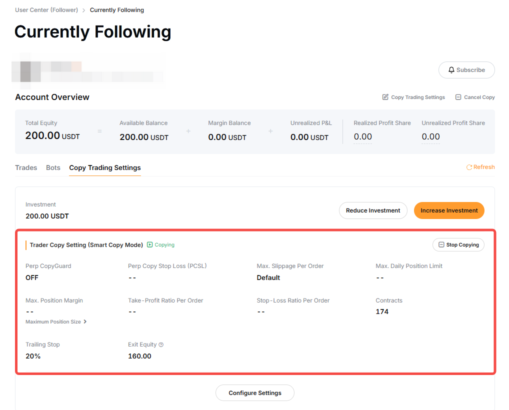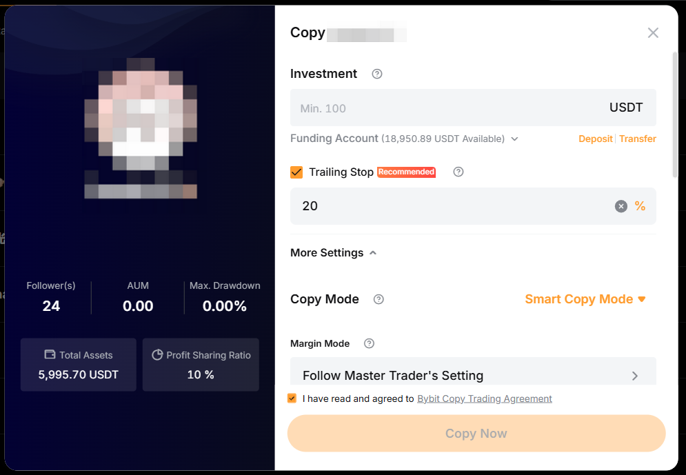 — 跟單交易經典版的最低投資額為 100 USDT。但是,交易達人可能會調高最低跟單本金要求。因此,跟單本金不得減少到低於 100 USDT 或交易達人要求的金額。
