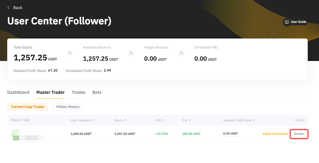 要對交易達人取消跟單,請前往跟單用戶中心 → 交易達人 → 當前跟單,然後點擊要取消跟隨的相應交易達人一側的詳情。