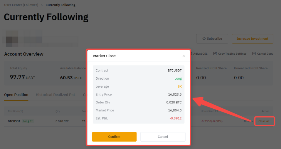 2. 繼續進行跟單交易,直到平倉。在此期間,系統僅會複製交易達人對該倉位的平倉信號,而不會複製交易達人的任何新訂單或對倉位的任何更改。