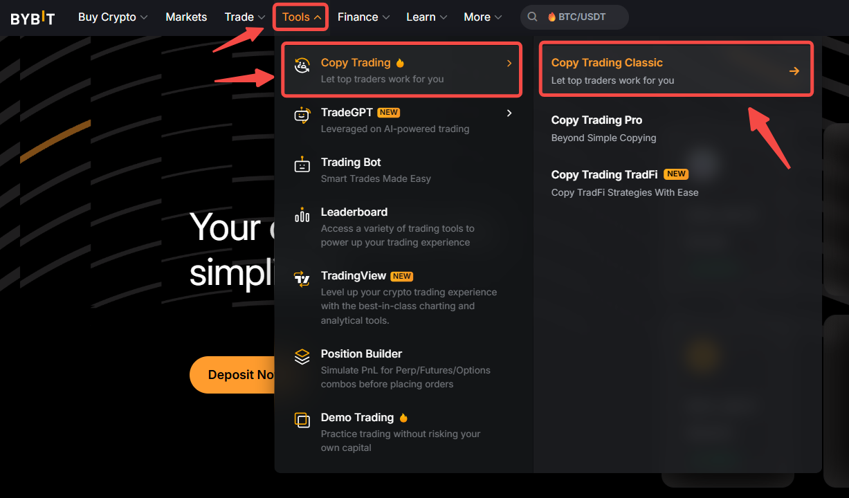 第 1 步:在導航欄中點擊工具→ 跟單交易,進入跟單交易經典版頁面。