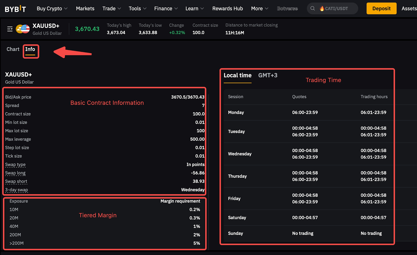 您可以直接在交易頁面上查看圖表和帳戶詳情,並透過點擊【資訊】標籤查看合約規格。