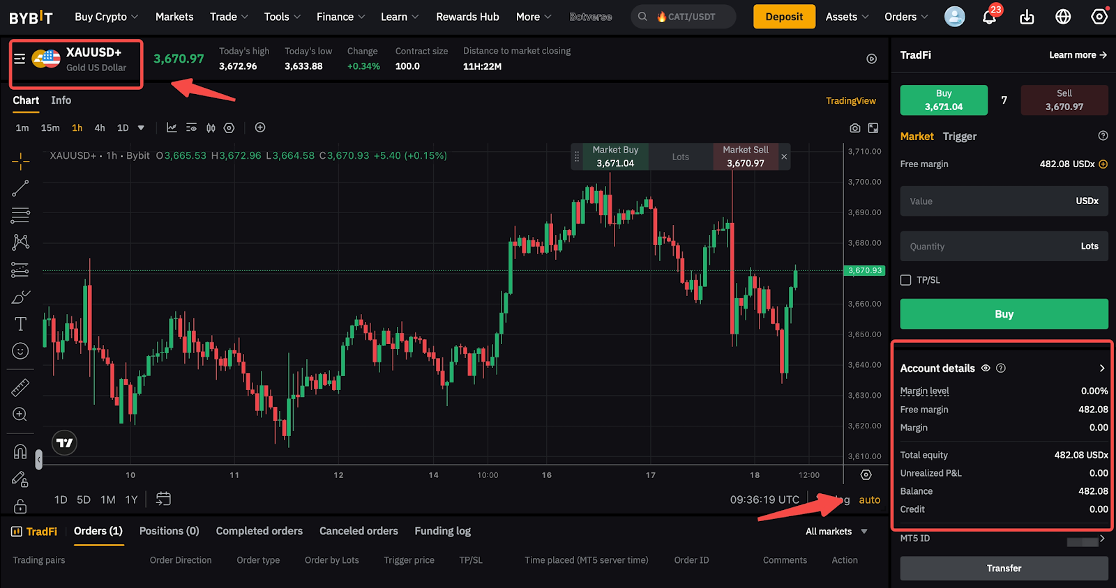第 2 步:在 Bybit TradFi 交易頁面上,按一下轉入按鈕將資金轉入您的 TradFi 帳戶。