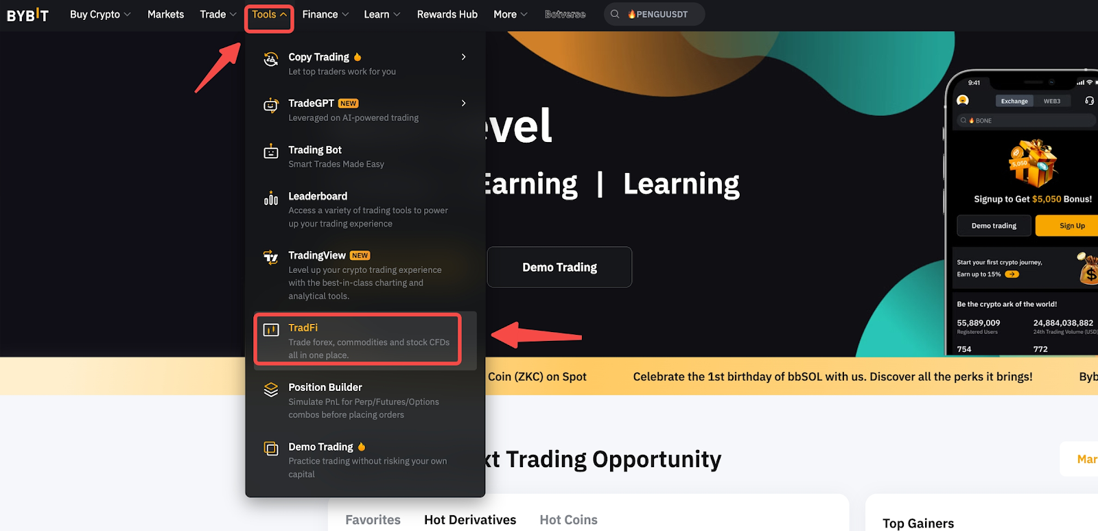 第 1 步:登入您的 Bybit 帳戶,將遊標停留在導覽列上的工具上,然後按一下 TradFi。
