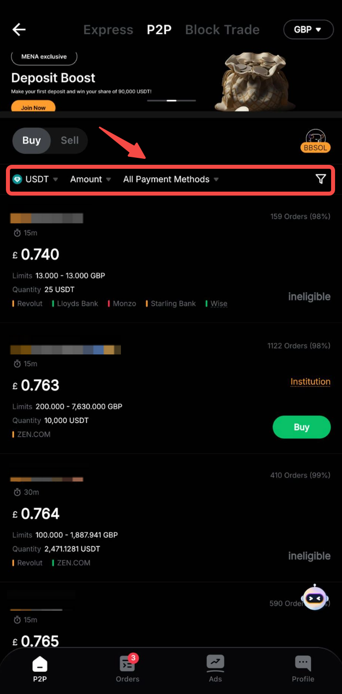 第 2 步:在“買入”頁面上,您可以根據您的交易要求,通過選擇所需的法定貨幣或付款方式 — 法定餘額標準來篩選廣告商。