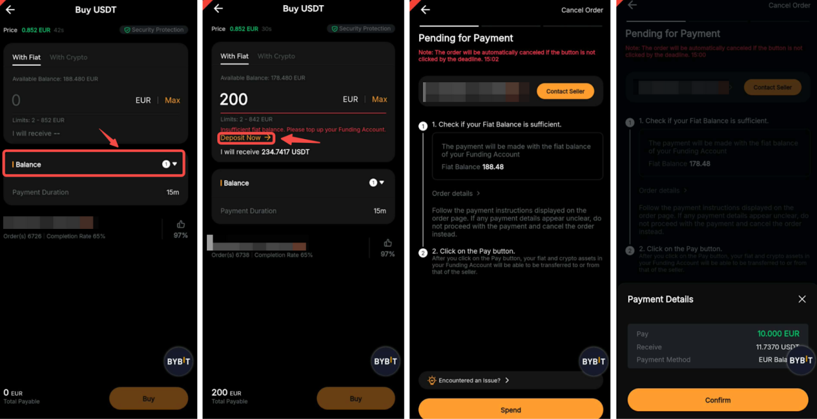 以下分步指南概述了如何使用您的法定餘額在 Bybit 完成首次 P2P 事務。