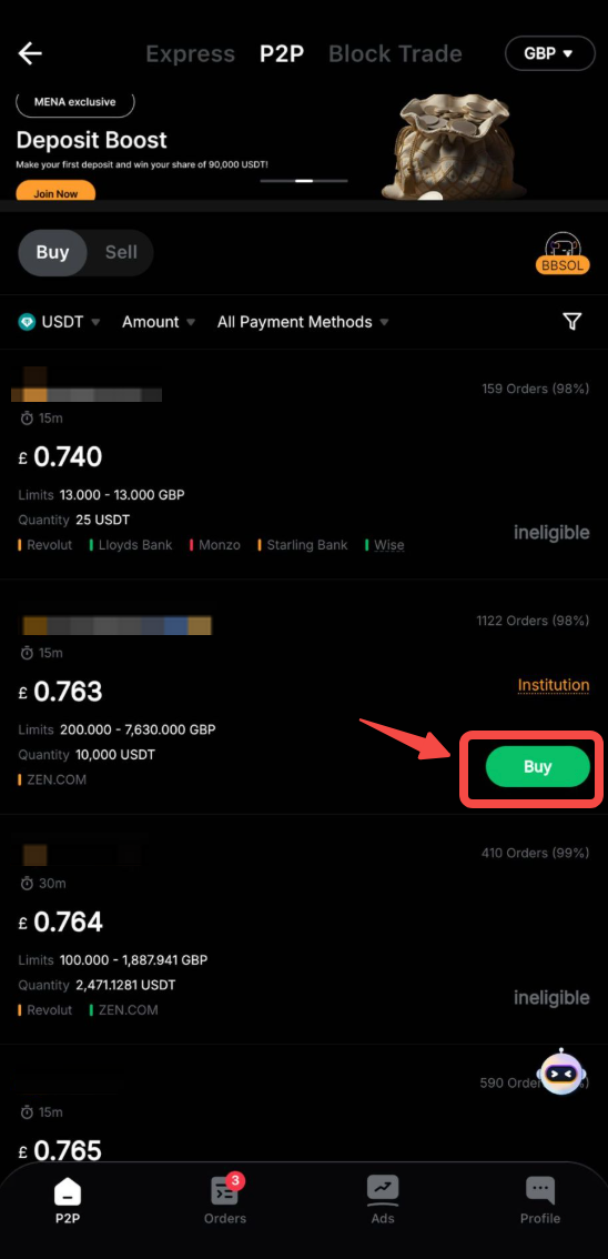 第 3 步:選擇您的首選廣告商,然後單擊買入。請確保您選擇的廣告商支持法幣付款。