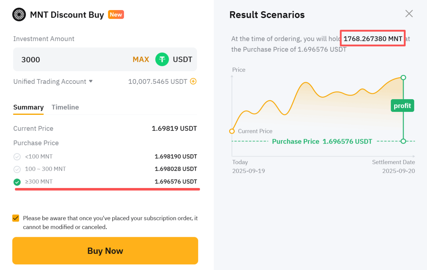 無論結算價格如何,交易員 B 將在結算日以 1.696576 USDT 的價格購買 MNT,收到約 1,768.267380 MNT (3,000 ÷ 1.696576) 。交易員 B 將在申購後立即享受 1,768.267380 MNT 的所有 MNT 持有權益。MNT 資產將在 1 天鎖定期後可供使用。