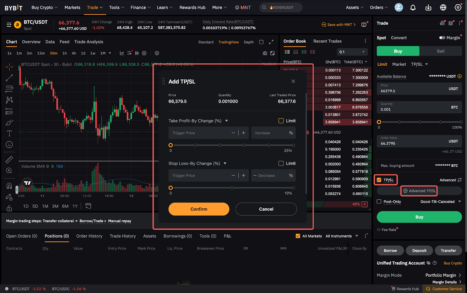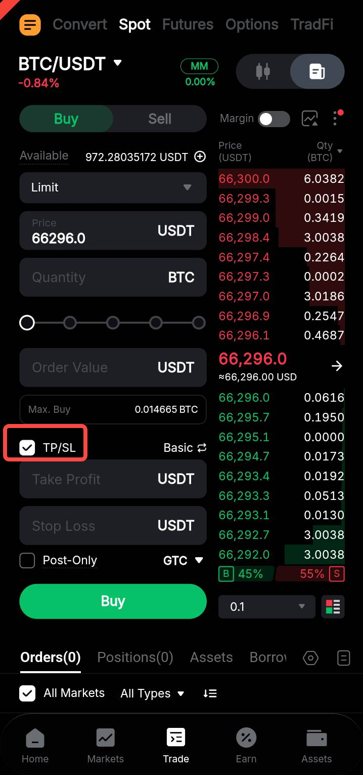 —止盈和止損的訂單價格不可超過限價單中為觸發價格而設置的合約價格限制。舉個例子,如果 BTC/USDT 的價格限製為 3%,則止盈/止損買入訂單價格不應超過觸發價格的 103%,而止盈/止損賣出訂單價格不應低於觸發價格的 97%。有關每個合約的具體價格限制,請參閱現貨交易規則。