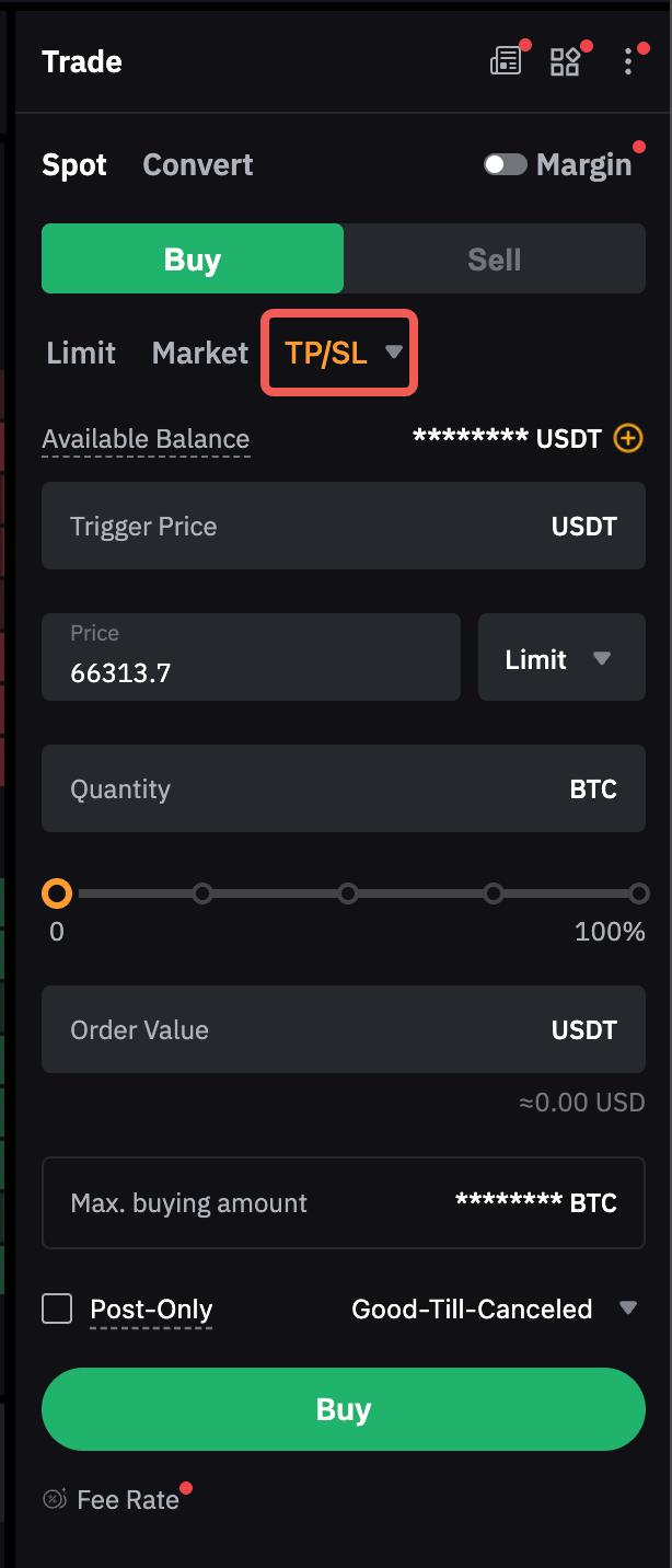 您可以設置止盈/止損訂單的觸發價格、訂單價格(限價單)和訂單數量。下達止盈/止損訂單時,將會佔用資產。一旦最新成交價達到預設的觸發價格,就會根據當前的訂單參數下達限價單或市價單。