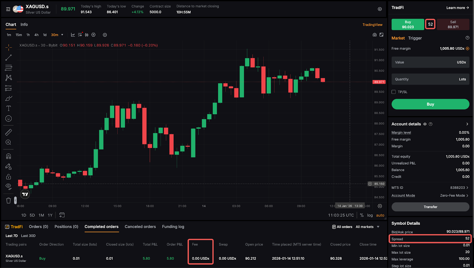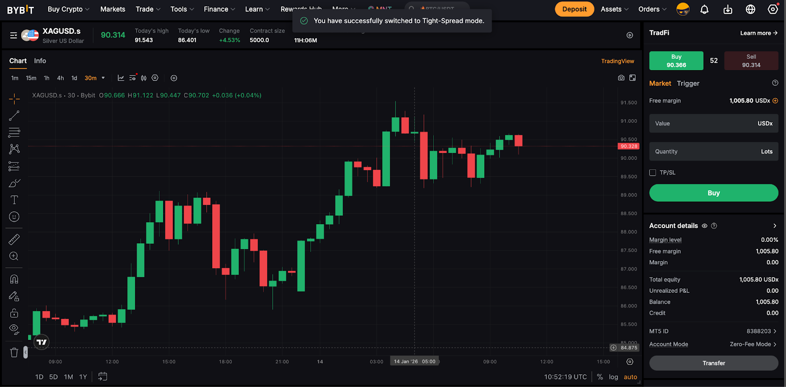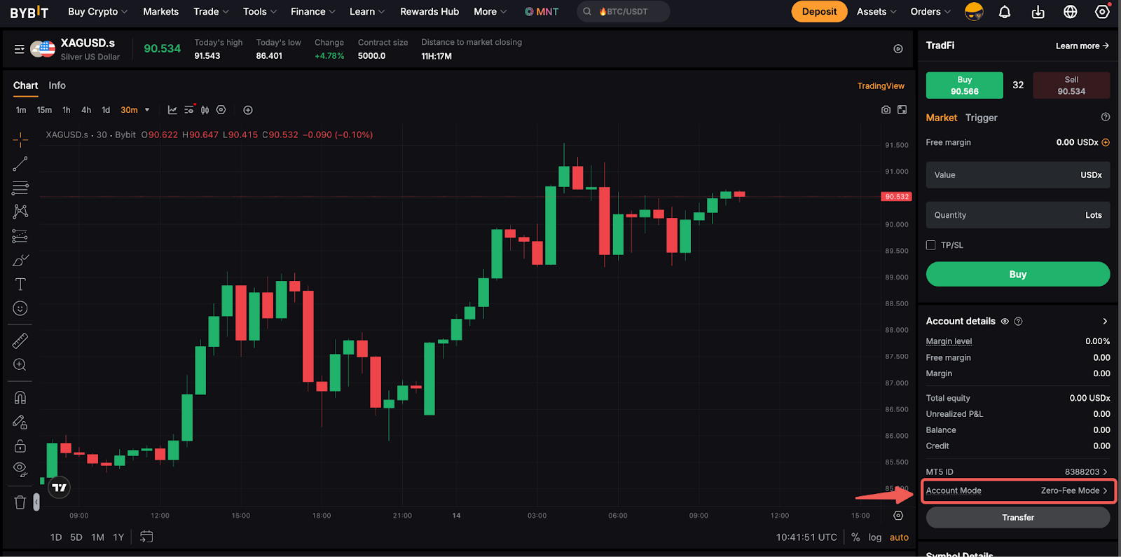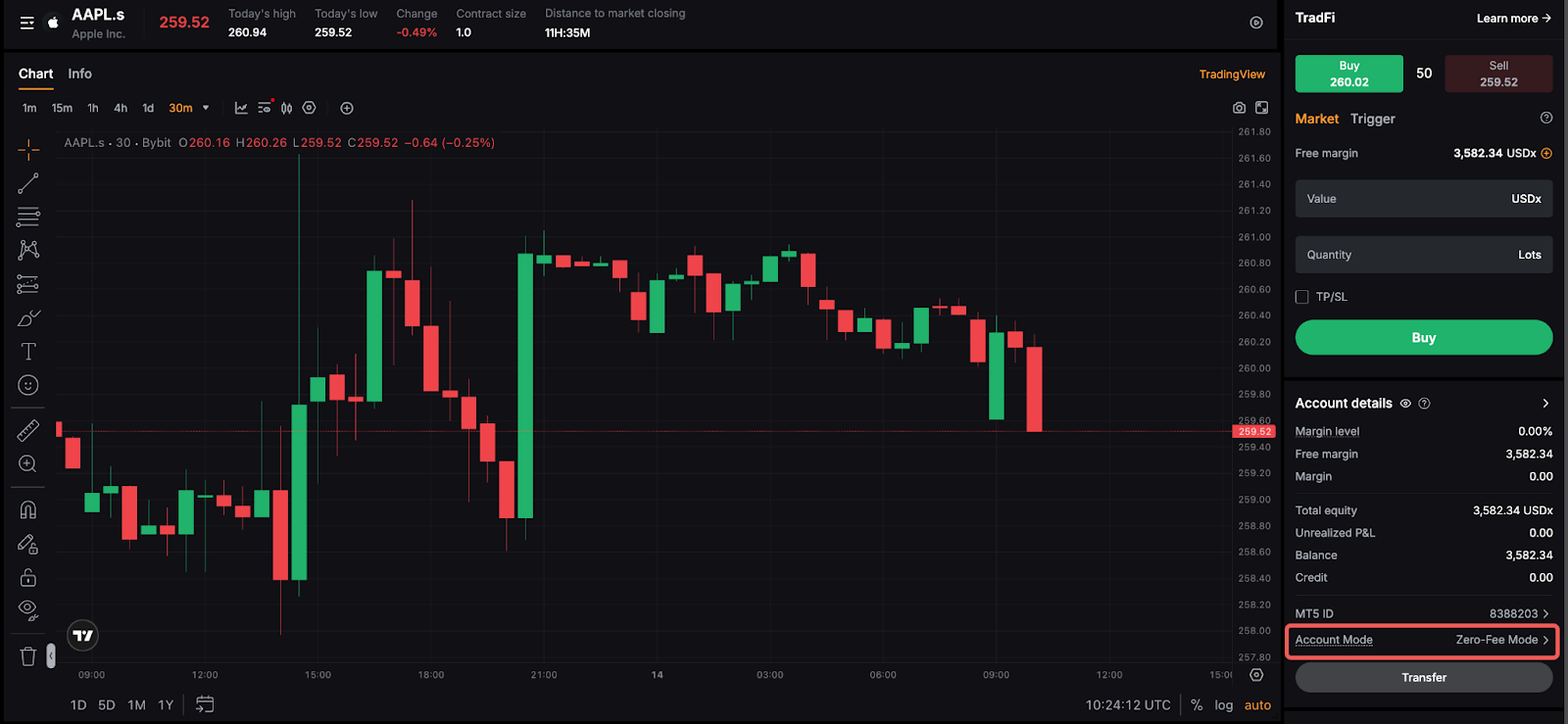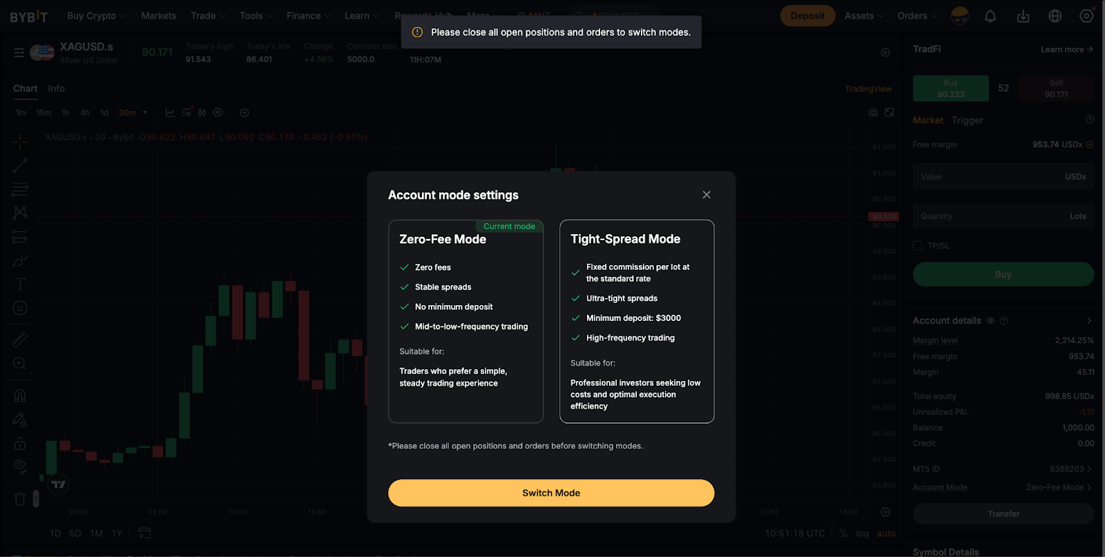 默認情況下,用戶的 TradFi 交易介面設定為零費用模式,而緊密點差模式只能透過滿足特定要求來啟用。用戶可以透過選中帳戶詳細信息下的帳戶模式部分來確定其 TradFi 帳戶的目前帳戶模式。