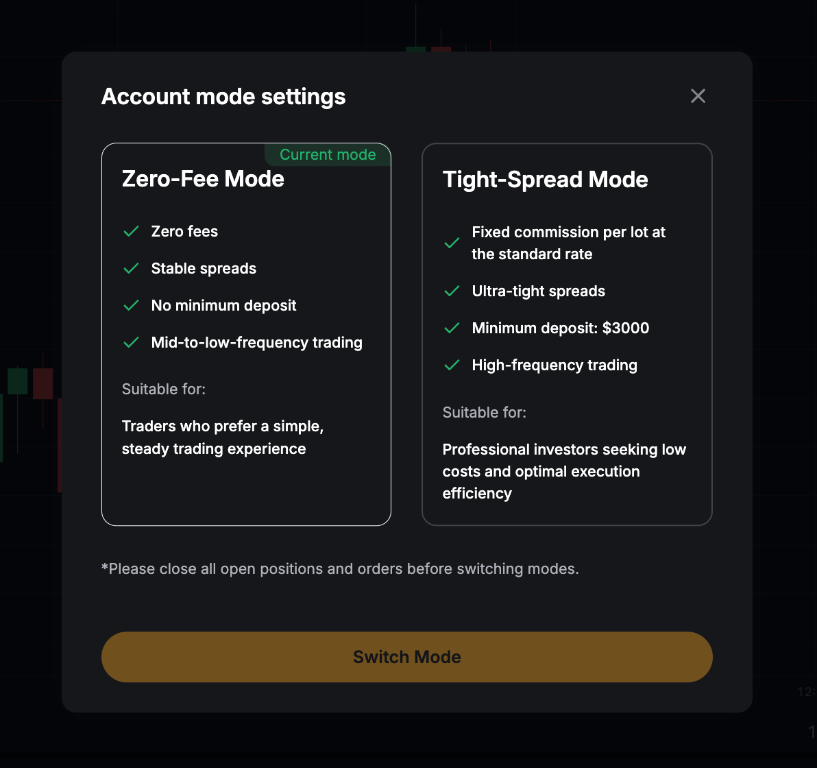 第 3 步:點擊任一模式以繼續。您已成功切換 TradFi 帳戶模式!