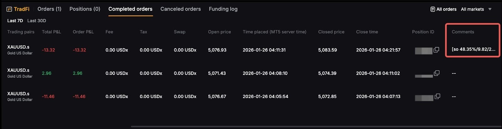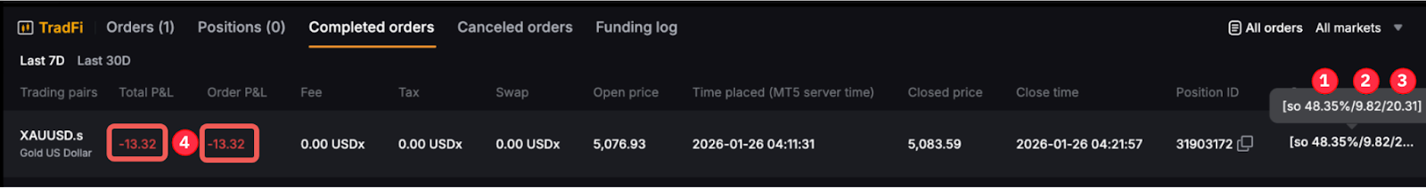 在 TradFi 上觸發保證金平倉後,將在「已完成訂單」標籤中顯示,如下圖: