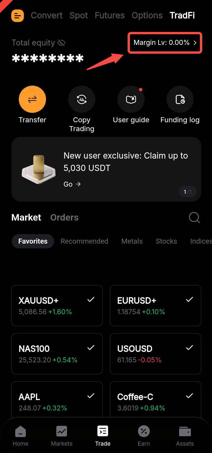 Bybit App 內的 TradFi 保證金等級可在下方「交易」標籤中找到。