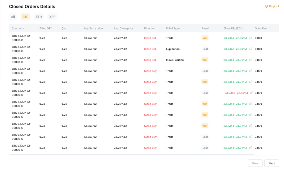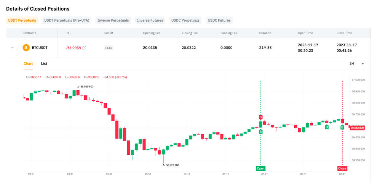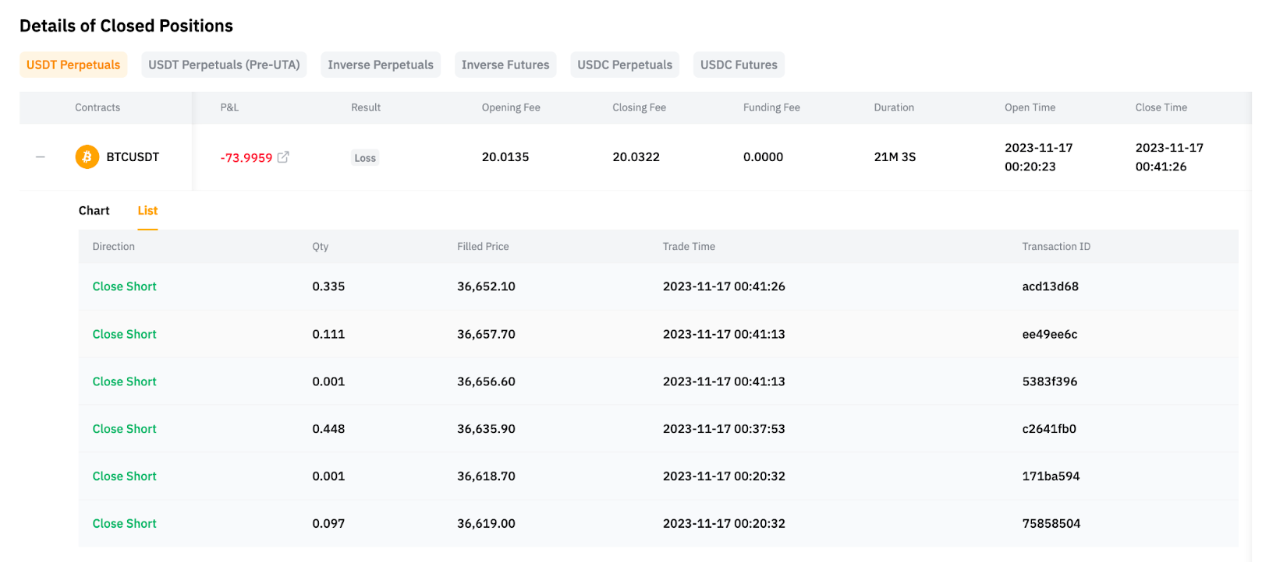 在此選項卡中,您可以查看已平倉的多倉和空倉的綜合記錄,包括從初始開倉訂單到最終平倉訂單的詳細信息。在較長時間內進行多次部分平倉的交易者可以評估其交易歷史、估算收益並衡量其策略是否成功。