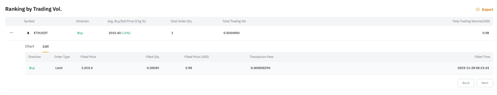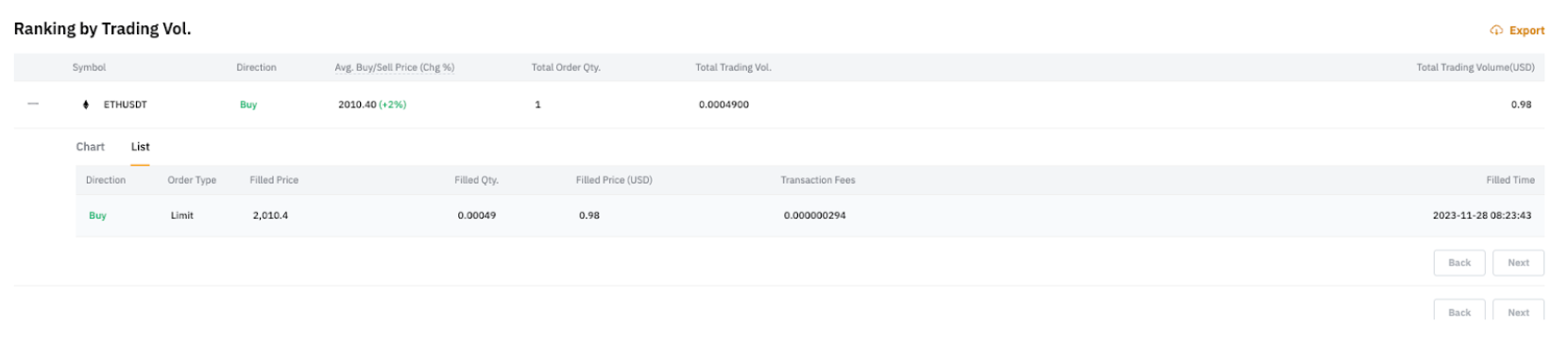 在列表選項卡中,您可以訪問在所選時間段內與該幣對相關的所有交易。